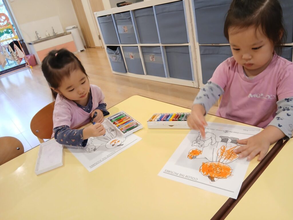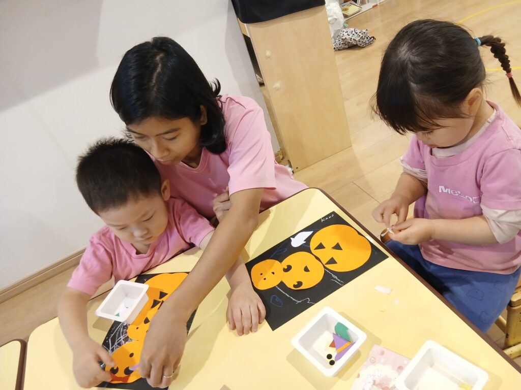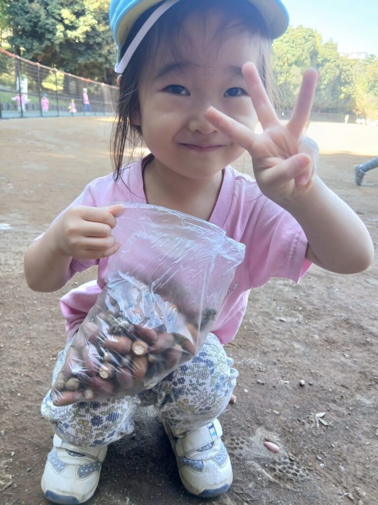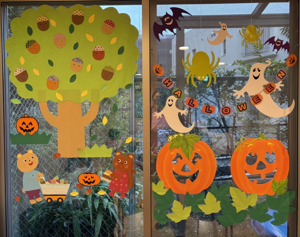 すっかり秋の空、上着が必要な日も増えてきました。子どもたちも気持ちのよいお天気の下、お外遊びを楽しんでいます。 袋いっぱいのどんぐり こんなところにカブトムシさん! ハロウィンに向けて、園内も盛り上がってきましたよ♪ ぺったんこ!個性的なかぼちゃさんができあがってきていますね ぎゅぎゅっと力強くおばけさんを塗っていきます! きれいな窓の装飾を見てるだけで楽しくなっちゃいます! Can’t wait for Halloween!!