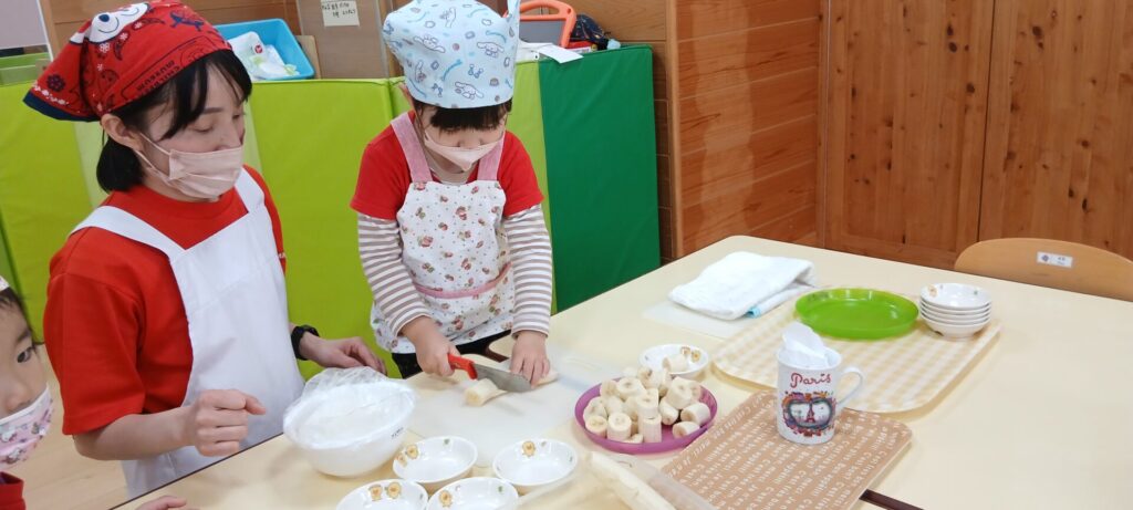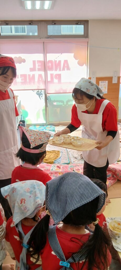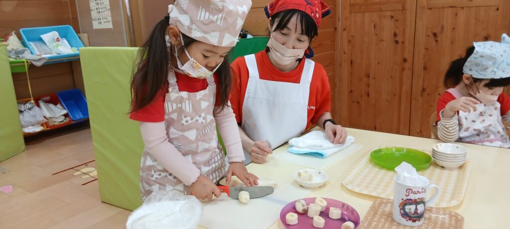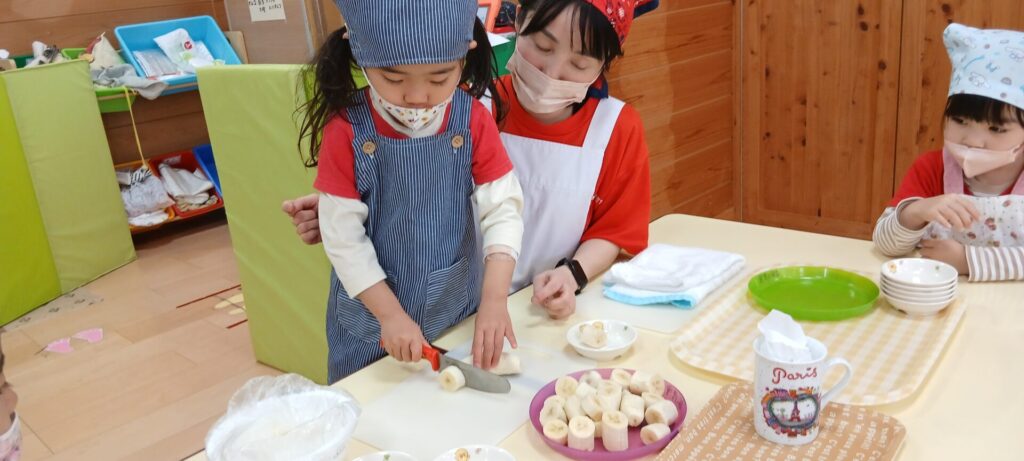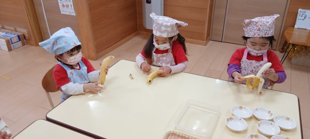 食育の一コマです!今日のおやつはBanana! まずはむいてみま~す。 じょうずじょうず折れないように、そぉっと持って・・・ 切って~ 切って~ 切って~ お皿にどんどん積みあがるバナナにご注目! 切ったバナナは、ちいさいお友だちとも一緒に食べます。 みんな喜ぶかな~? 楽しい食育タイムでした♪