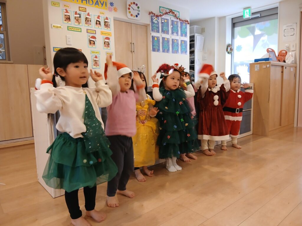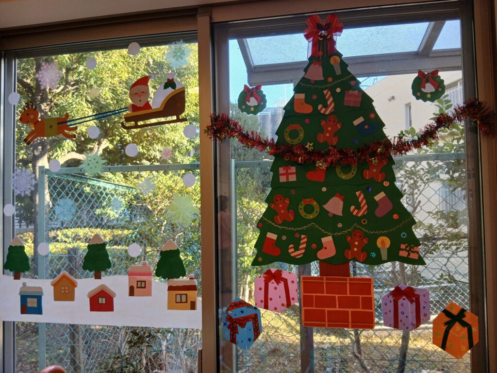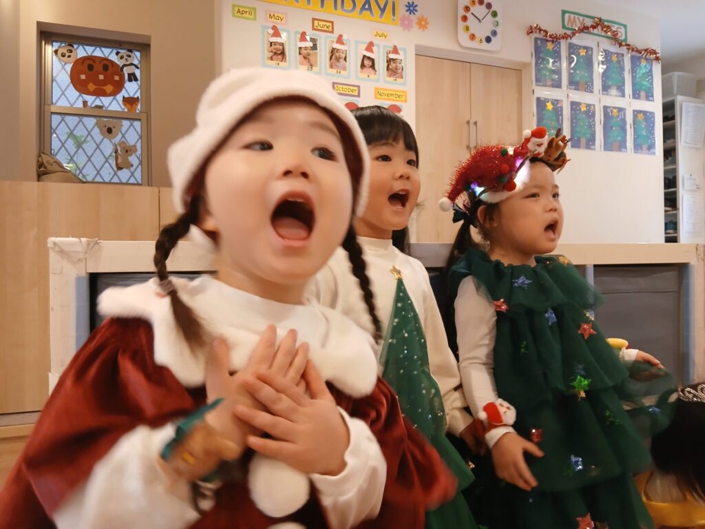 みんなが待っていたクリスマス会♪ イエス様誕生のお話を英語で楽しみ、お歌を歌って、サンタさんからプレゼントをもらいました! クリスマスってなあに? サンタさんもいっしょにお話を楽しみます。サンタさんのそばにある袋の中身が気になるかな? ジングルベルを歌いました♪衣装がカワイイ!! 心を込めて歌います。素敵な歌声が聞こえてきそう…. 窓のデコレーション とっても華やかでわくわくしますね Merry Christmas, everyone!!!