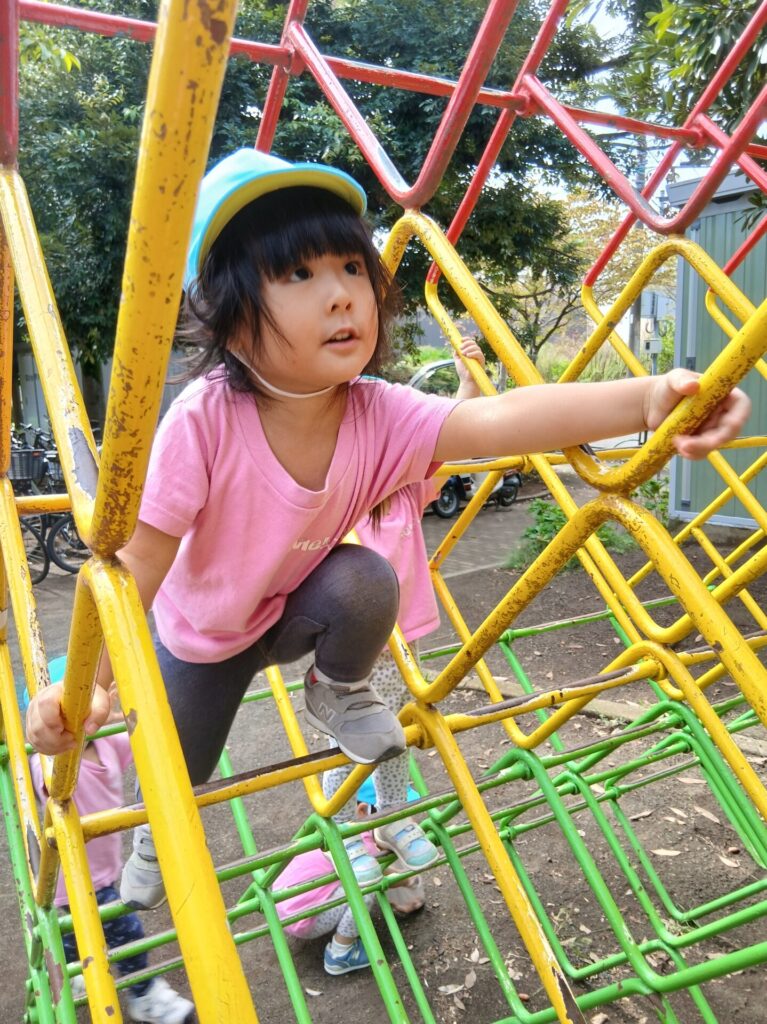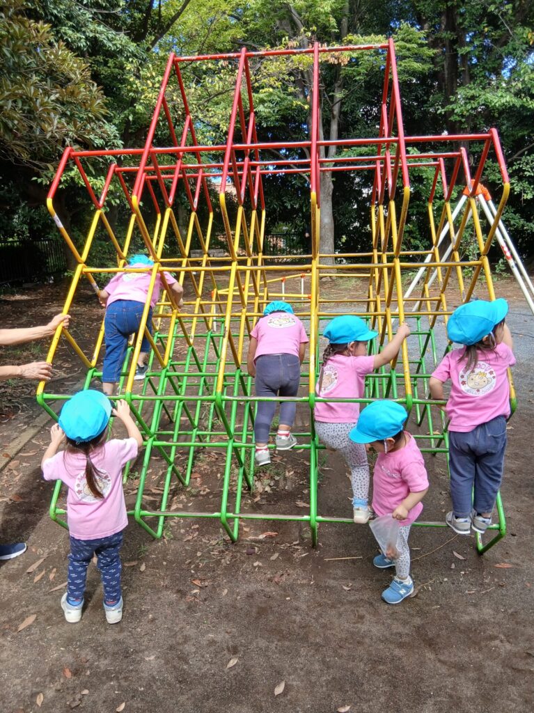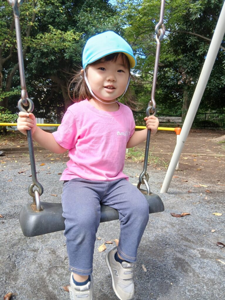見上げれば秋の空。お外で気持ちよく遊べる日も増えてきました。これから運動会や遠足など楽しいイベントが待ち遠しいですね。 Swing, smile, breeze! Up, up, go! Almost to the top! You rock!