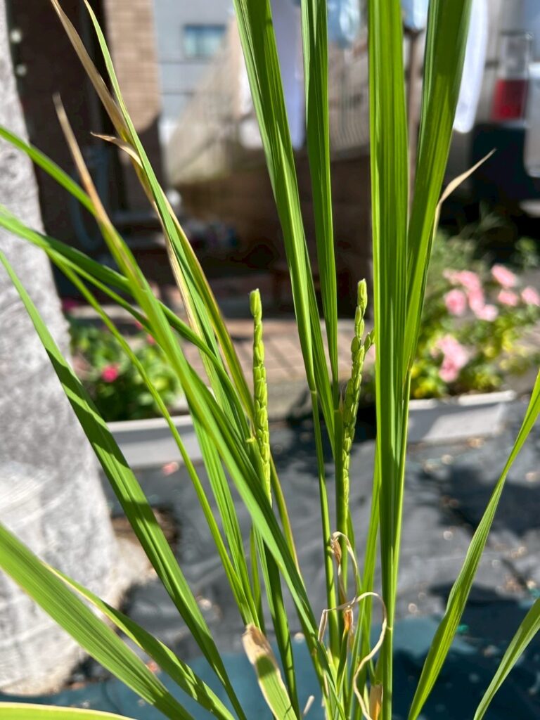 近隣の方に頂いた稲穂の粒を育てていました。その小さな粒が、青々と美しい稲穂へと成長しました!