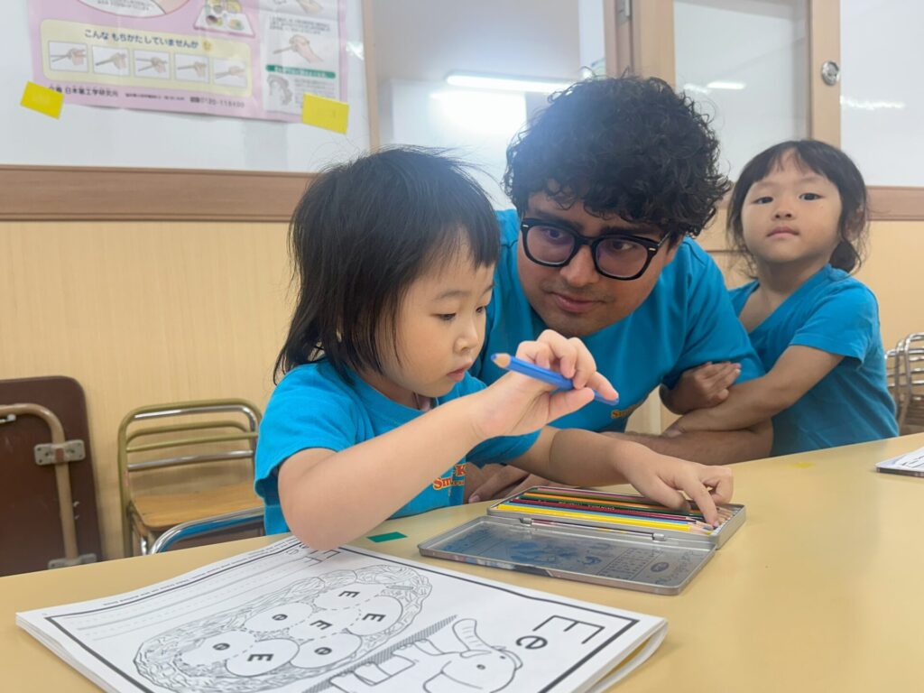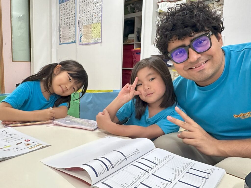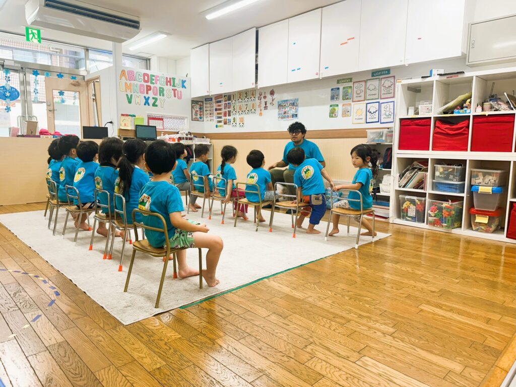 スマイリーキッズに新しいネイティブの先生が来てくれました! 新しいことが大好きな子どもたちは、さっそく先生に興味津々。やさしい先生とすぐに仲良くなりました♪ よろしくね! モーニングサークルタイム♪ せんせい、こっちもきて!!